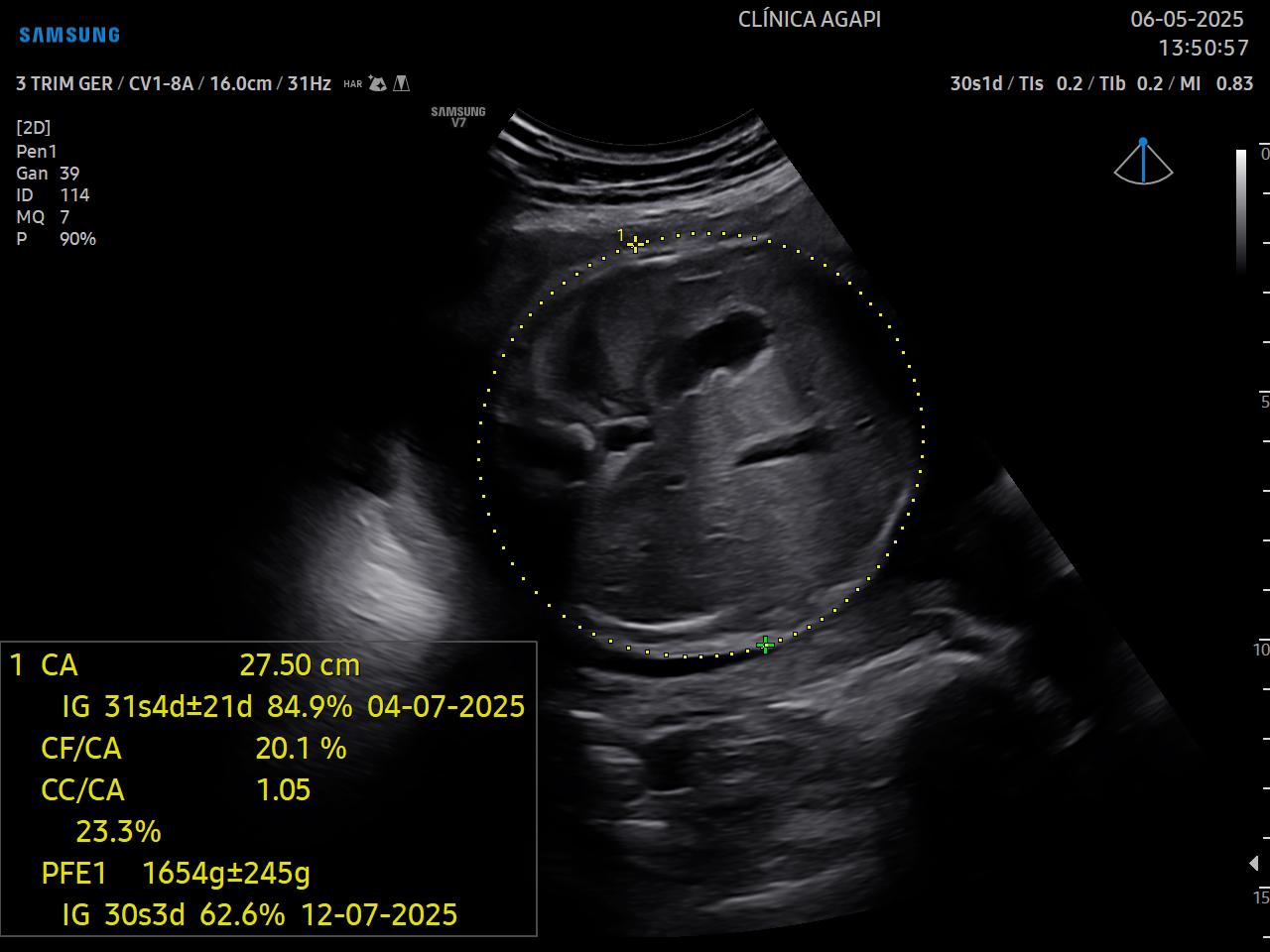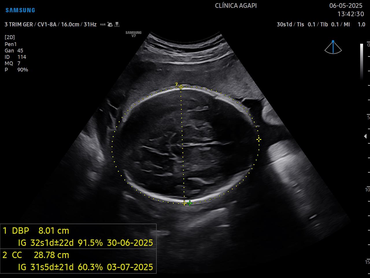 Exame realizado geralmente no 3º trimestre, avalia o crescimento e bem-estar fetal.
