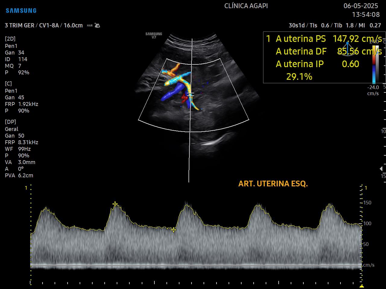 O doppler materno inclui a avaliação das artérias uterinas e o doppler fetal: artéria umbilical, artéria cerebral média, relação cérebro-placentária e quando necessário, ducto venoso.